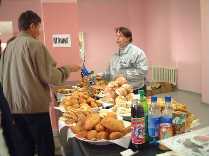 この日は午前に試合の後、午後は待ちに待ったスーパーリーグ観戦でした。アムールが迎え撃つのは強豪「アク・バルス」です。4500人くらい入る会場は立ち見も出るほどの超満員です。ハバロフスクではホッケーがナンバーワンスポーツであると思い知らされるその熱気!!試合前に売店に買い物に行くと売店にはホットドックならぬピロシキが、、、さすがはロシアです。ビールを所望した某スタッフのためにビールを買っていこうとすると入り口でセキュリティが「アルコールはアリーナには持ち込んじゃダメ!!」とのサイン。「じゃあこんなにいっぱいビール売るなよ!」と思っていると、なんとそのセキュリティが「袖の下に隠して持ち込め」のサイン!!ああ、そういうことね。案の定アリーナの中ではビールをガンガン飲んでいる人たちが多数いました。