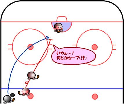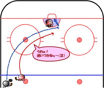 ルール解釈が厳しくなり、スティックを使って相手を止めることができなくなった今日この頃、実際1対1でスピードに差があったら抜かれてしまうのは避けられなくなってきました。なによりもバックスケーティングでの機動力を上げることが先決です。しかしそれは時間がかかること。どうしても抜かれそうなら、以下の要領で対応してください。